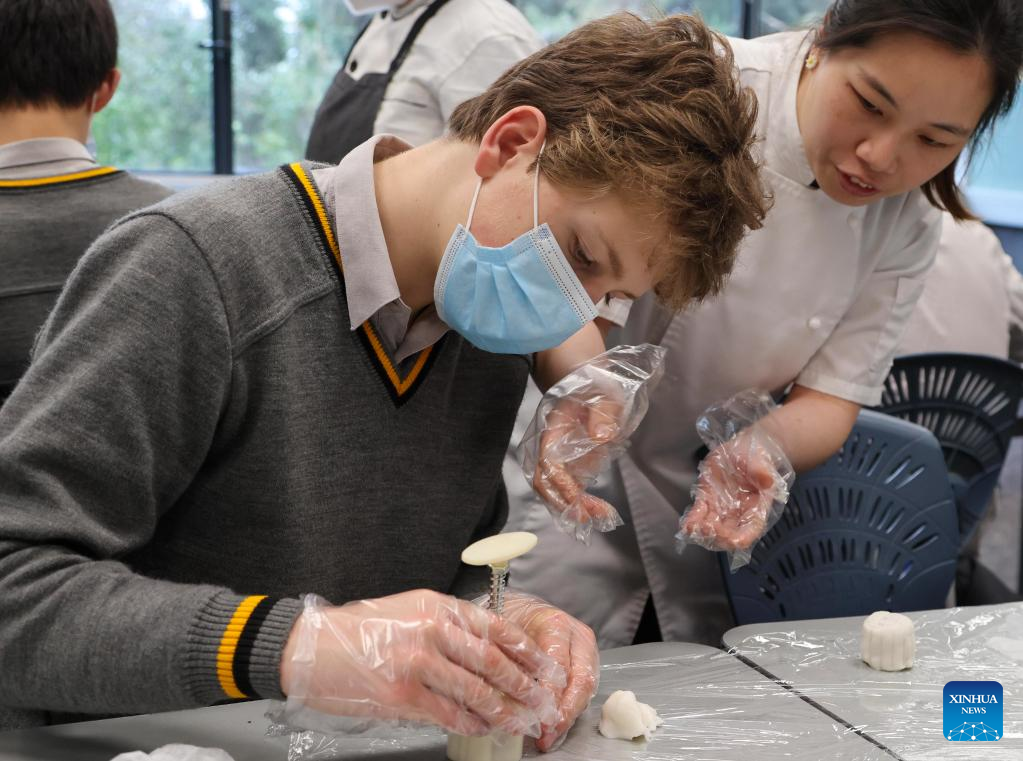 A student makes a moon cake at a Chinese class to celebrate the upcoming Mid-Autumn Festival at a school in Wellington, New Zealand, Sept. 5, 2022. (China Cultural Centre in Wellington/Handout via Xinhua)