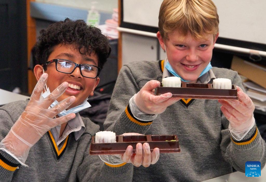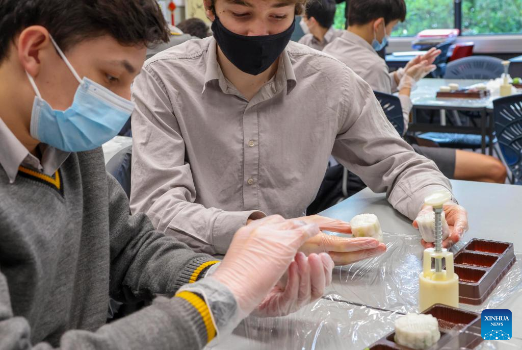 Students make moon cakes at a Chinese class to celebrate the upcoming Mid-Autumn Festival at a school in Wellington, New Zealand, Sept. 5, 2022. (China Cultural Centre in Wellington/Handout via Xinhua)
