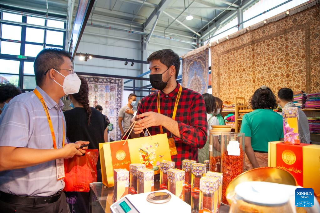 A visitor (L) shops at the booth of Iran at an exhibition of Cultural and Tourism Services at the Shougang Park during the 2022 China International Fair for Trade in Services (CIFTIS) in Beijing, capital of China, Sept. 5, 2022. The 2022 CIFTIS closed on Monday. (Xinhua/Zhang Fan)