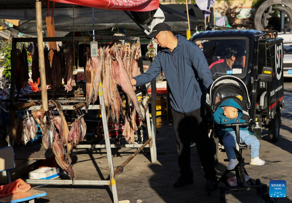 Photo taken on Sept. 4, 2022 shows fish aired in front of a stall at Dongji fish market, literally means the easternmost fish market, in Fuyuan City, northeast China's Heilongjiang Province.
