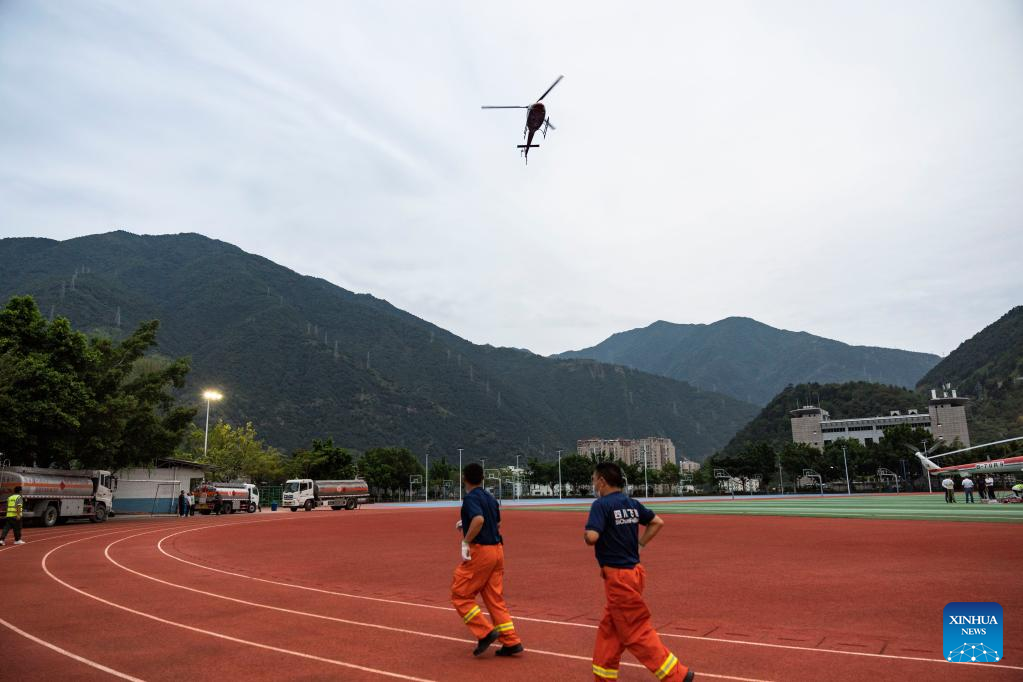 A rescue helicopter prepares to land at a middle school in Shimian County of Ya'an City, southwest China's Sichuan Province, Sept. 6, 2022.