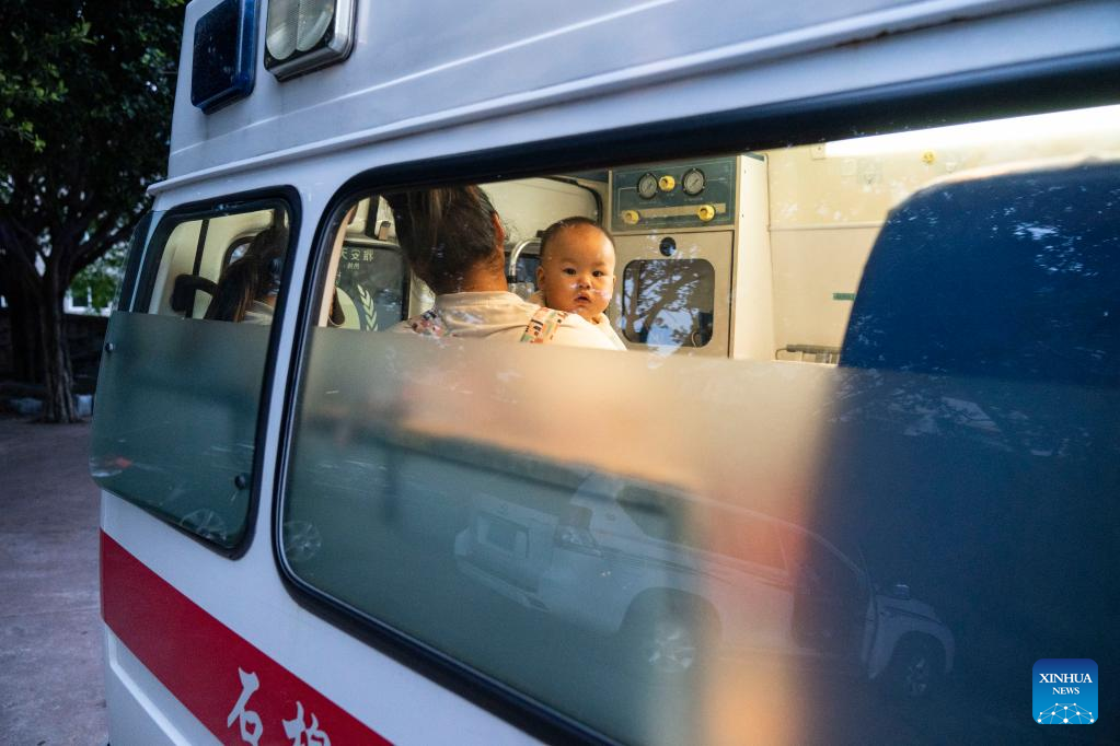 A baby looks through the window in an ambulance in Shimian County of Ya'an City, southwest China's Sichuan Province, Sept. 6, 2022.