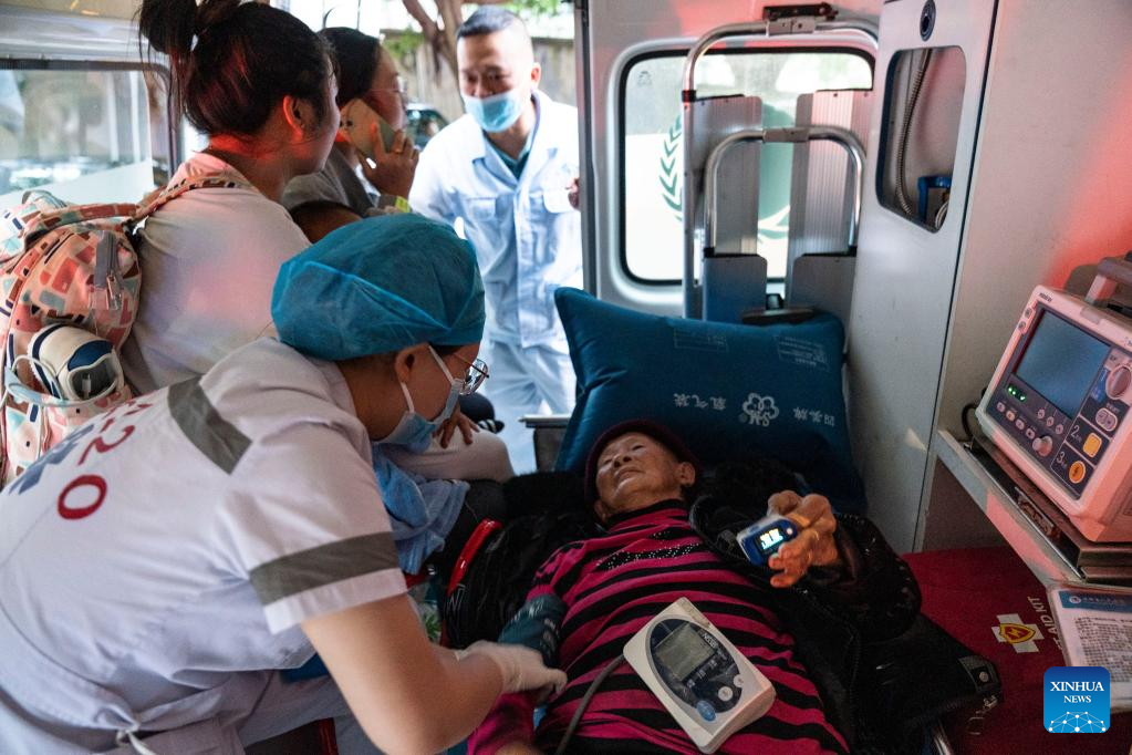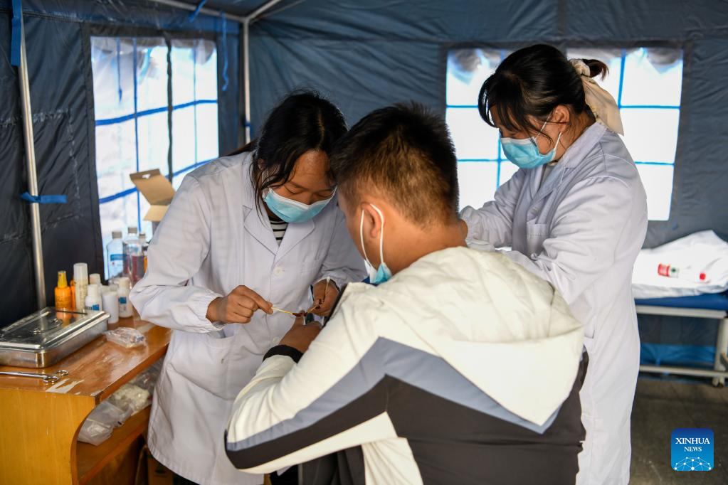 Medical workers clean the wound for a quake-affected resident in Wajiao Village of Wanggangping Township in Shimian County of Ya'an City, southwest China's Sichuan Province, Sept. 6, 2022.