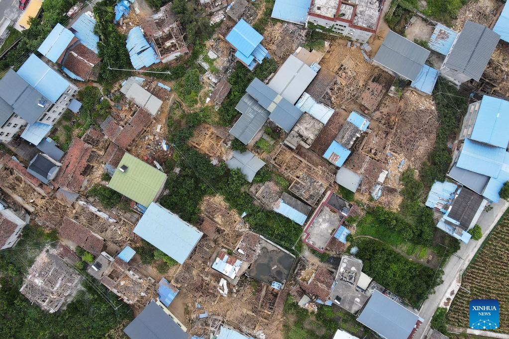 Aerial photo taken on Sept. 6, 2022 shows some old houses damaged in an earthquake in Wanggangping Township in Shimian County of Ya'an City, southwest China's Sichuan Province.