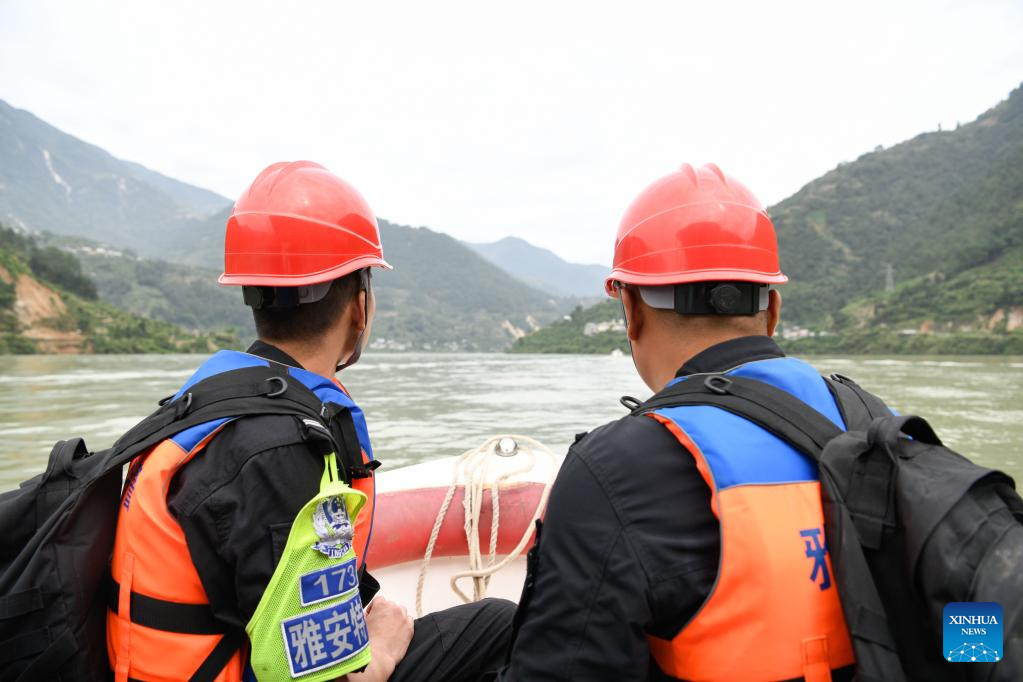 Rescue workers take a boat to Wanggangping Township of Shimian County in southwest China's Sichuan Province, Sept. 6, 2022.