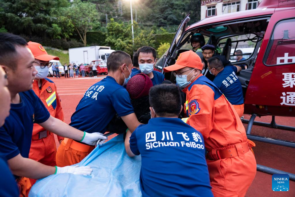 Rescue workers transfer an injured senior resident in Shimian County of Ya'an City, southwest China's Sichuan Province, Sept. 6, 2022.
