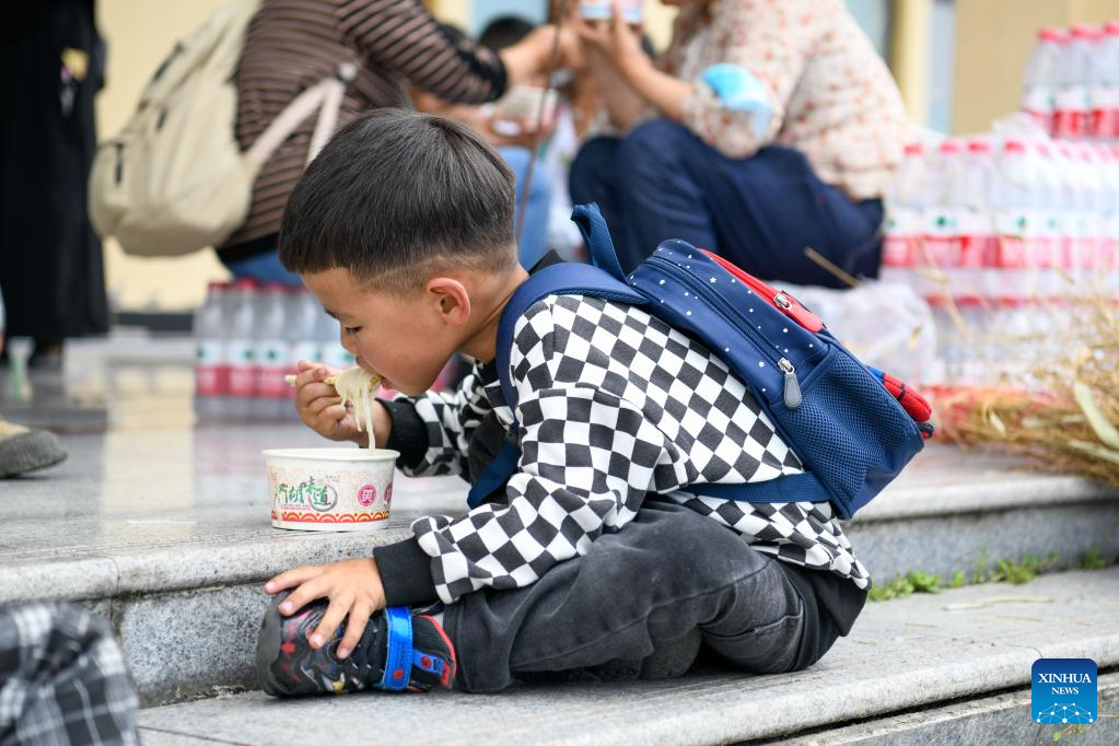 A child has lunch at a quake relief shelter in Wajiao Village of Wanggangping Township in Shimian County of Ya'an City, southwest China's Sichuan Province, Sept. 6, 2022.