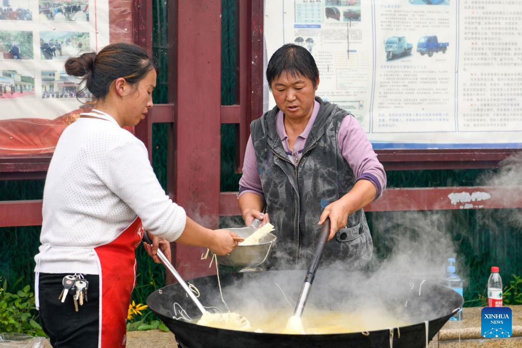 Villagers cook lunch at a quake relief shelter in Wajiao Village of Wanggangping Township in Shimian County of Ya'an City, southwest China's Sichuan Province, Sept. 6, 2022.