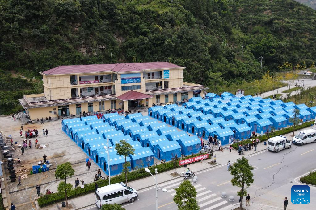 Aerial photo taken on Sept. 6, 2022 shows a quake relief shelter in Wajiao Village of Wanggangping Township in Shimian County of Ya'an City, southwest China's Sichuan Province.