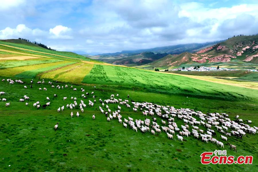 Autumn settles over the Qilian Mountains, Qilian county in Haibei Tibetan autonomous prefecture, Northwest China's Qinghai Province. Golden fields and green grasslands created an unique autumn scenery. (Photo: China News Service/Yang Chunli)