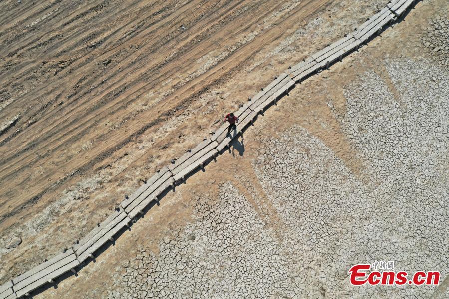 The 2,657-metre-long bridge built in Ming Dynasty (1368-1644) reappears as the water level continued to drop at Poyang Lake, Jiujiang city, east China's Jiangxi Province, Sept. 6, 2022. (Photo: China News Service/Liu Zhankun)