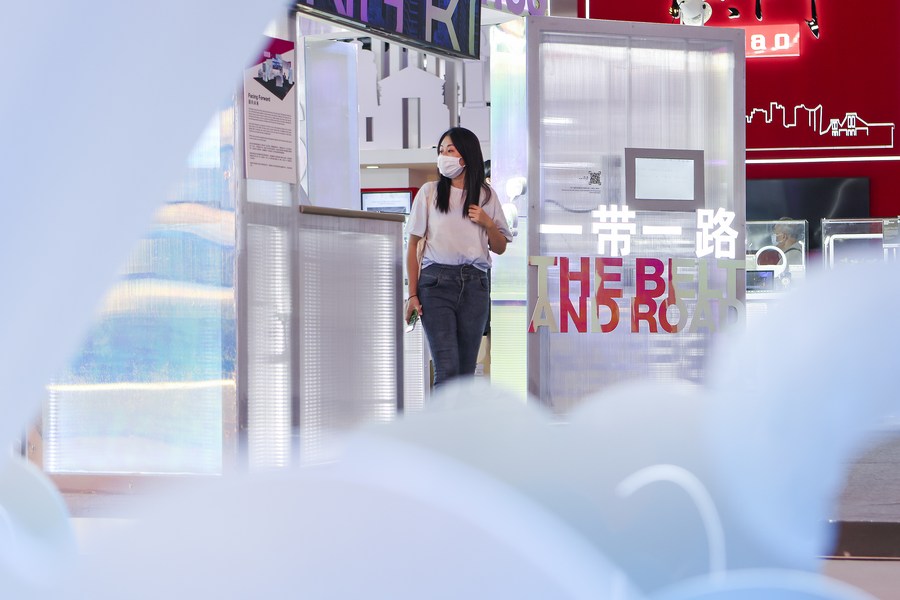 A woman visits an exhibition hall of the China National Convention Center during the 2022 China International Fair for Trade in Services (CIFTIS) in Beijing, capital of China, Sept. 5, 2022. (Xinhua/Hao Zhao)