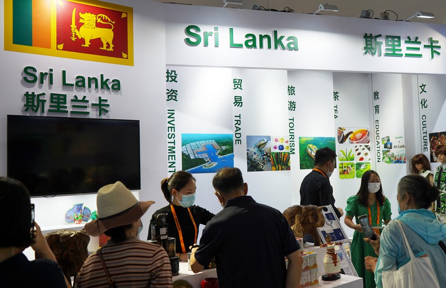 People visit the booth of Sri Lanka at an exhibition hall of the China National Convention Center during the 2022 China International Fair for Trade in Services (CIFTIS) in Beijing, capital of China, Sept. 5, 2022. (Xinhua/Jin Haoyuan)