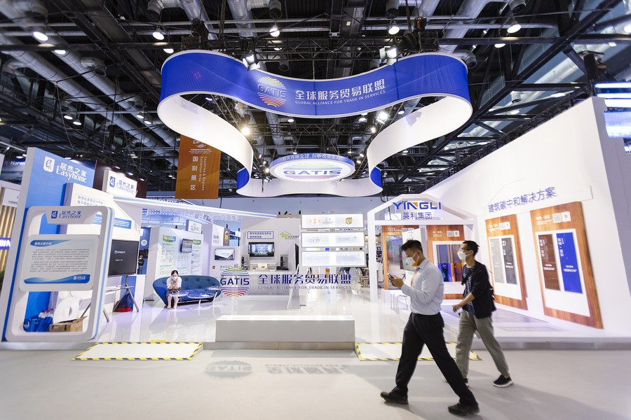Photo taken on Sept. 5, 2022 shows the booth of Global Alliance for Trade in Services at an exhibition hall of the China National Convention Center during the 2022 China International Fair for Trade in Services (CIFTIS) in Beijing, capital of China. (Xinhua/Hao Zhao)