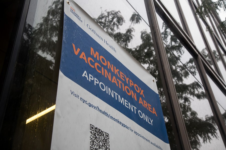 A sign is displayed on the window of a monkeypox vaccination site in New York, the United States, on Sept. 6, 2022. (Photo by Michael Nagle/Xinhua)