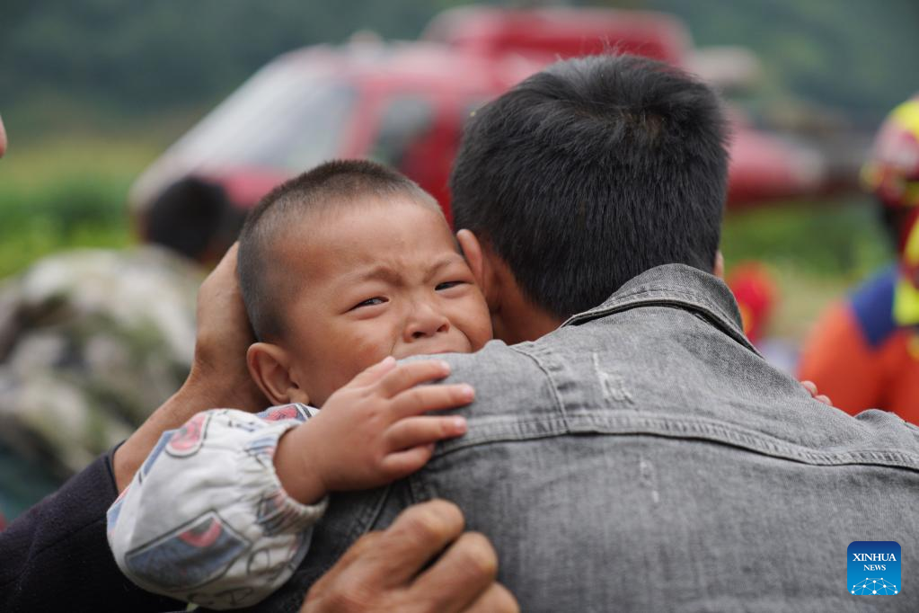 A man holding his child prepares to board a helicopter in Xingfu Village of Shimian County, southwest China's Sichuan Province, Sept. 7, 2022. A 6.8-magnitude earthquake jolted southwest China's Sichuan Province on Monday, and Shimian County in Ya'an were one of the hardest-hit areas. The quake damaged houses, roads, water conservancy facilities, hydropower stations, and telecommunications.