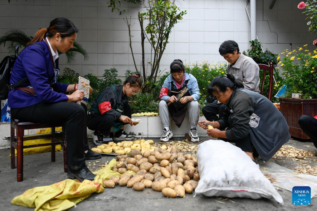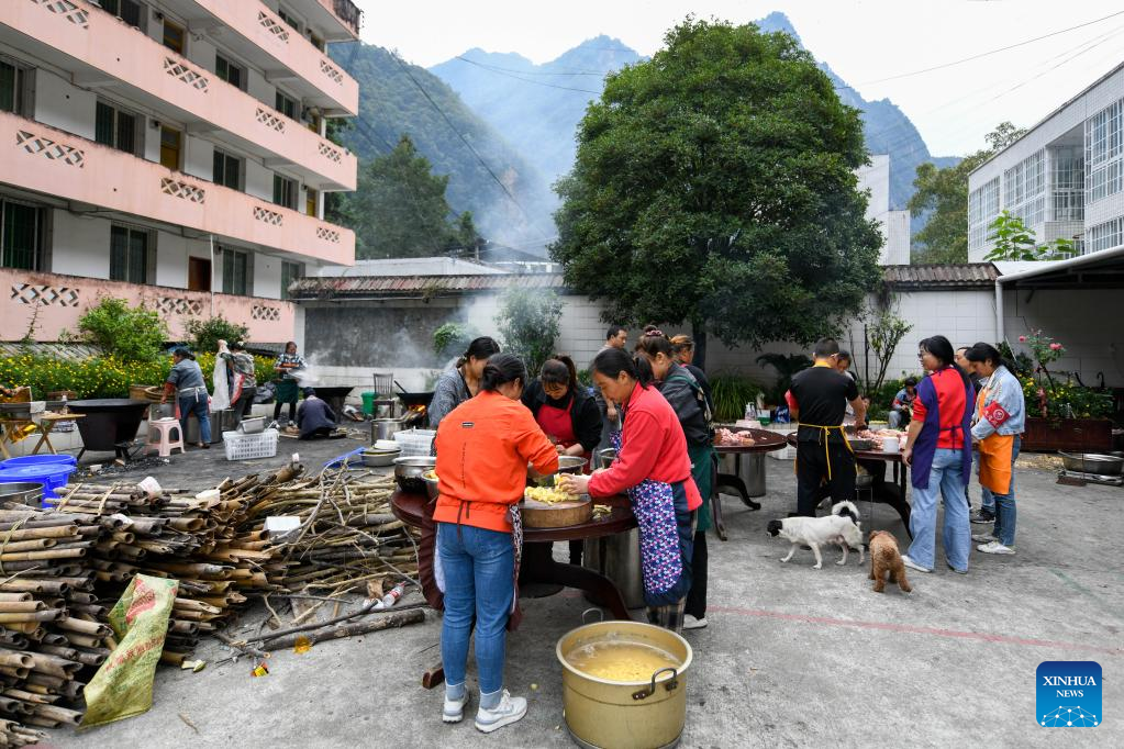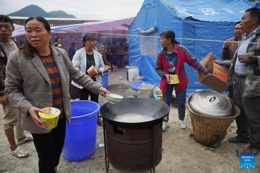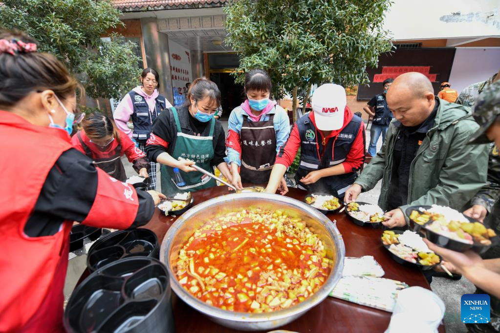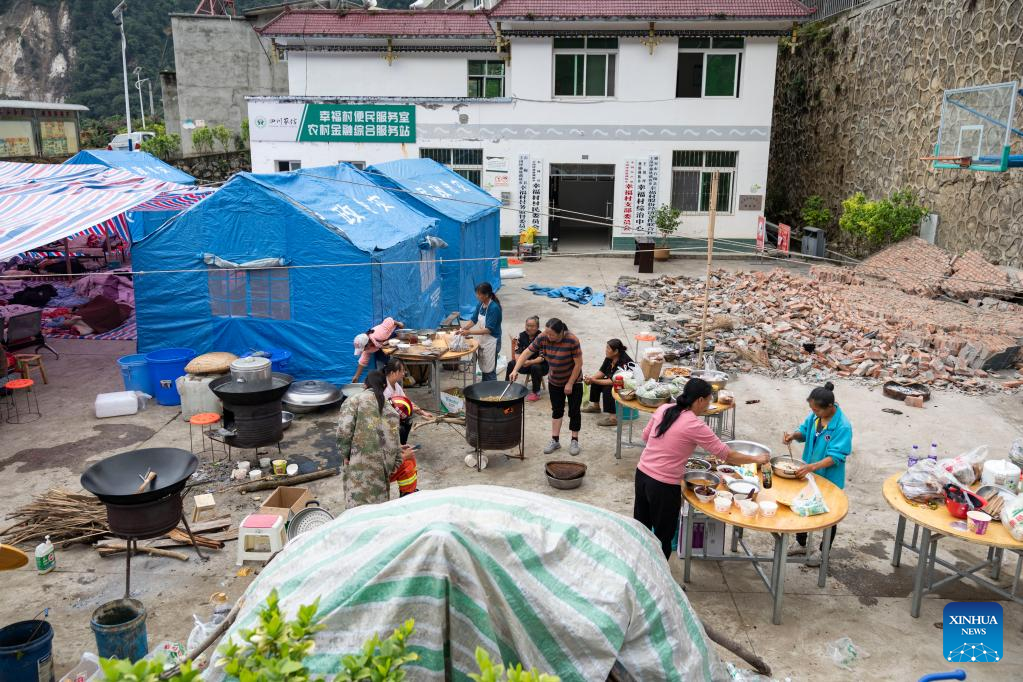 Villagers prepare to have meal at a quake relief shelter in Xingfu Village of Shimian County, southwest China's Sichuan Province, Sept. 7, 2022. A 6.8-magnitude earthquake jolted southwest China's Sichuan Province on Monday, and Shimian County in Ya'an were one of the hardest-hit areas. The quake damaged houses, roads, water conservancy facilities, hydropower stations, and telecommunications.