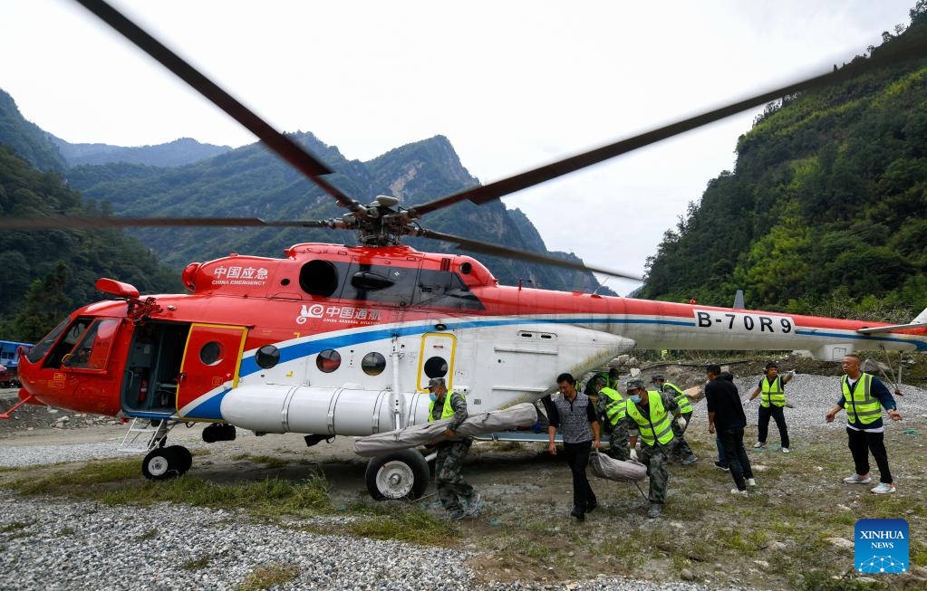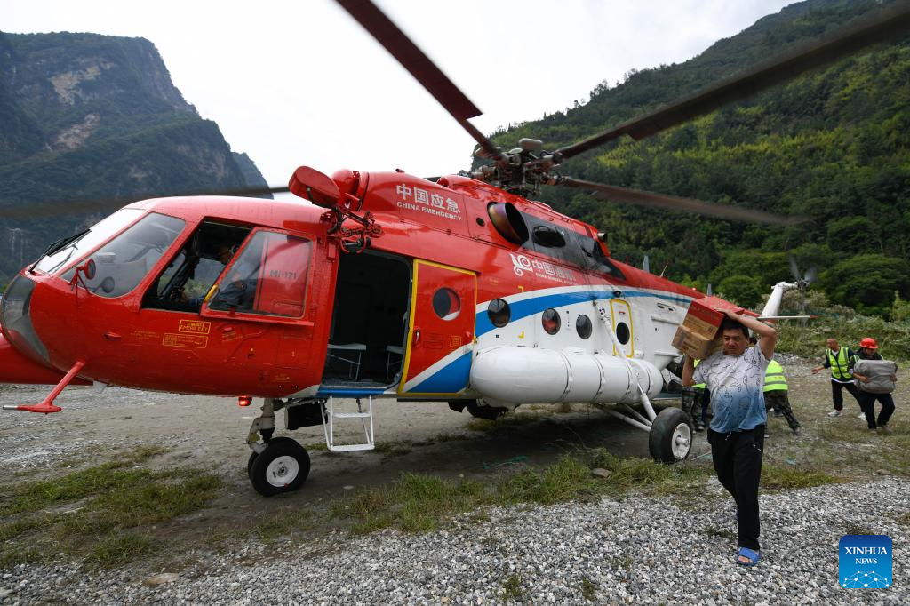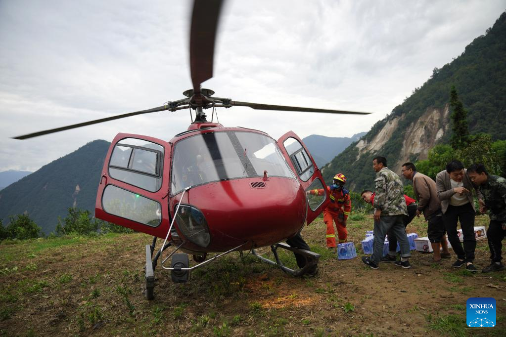 Rescuers and villagers transfer food and water from a helicopter in Xingfu Village of Shimian County, southwest China's Sichuan Province, Sept. 7, 2022. A 6.8-magnitude earthquake jolted southwest China's Sichuan Province on Monday, and Shimian County in Ya'an were one of the hardest-hit areas. The quake damaged houses, roads, water conservancy facilities, hydropower stations, and telecommunications.