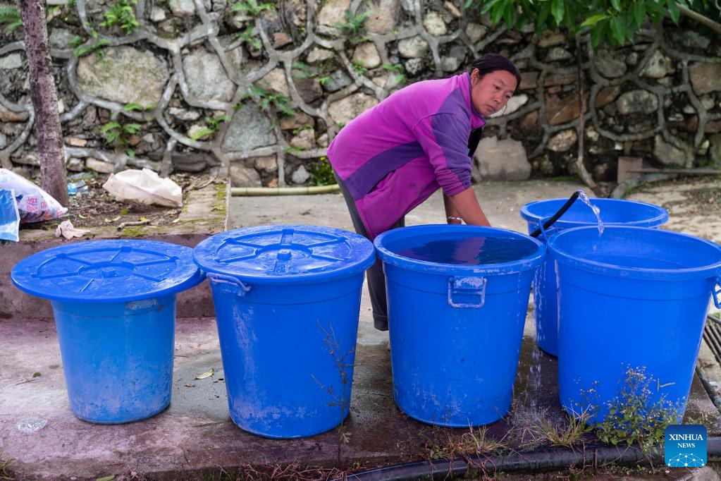 A villager collects spring water in Xingfu Village of Shimian County, southwest China's Sichuan Province, Sept. 7, 2022. A 6.8-magnitude earthquake jolted southwest China's Sichuan Province on Monday, and Shimian County in Ya'an were one of the hardest-hit areas. The quake damaged houses, roads, water conservancy facilities, hydropower stations, and telecommunications.