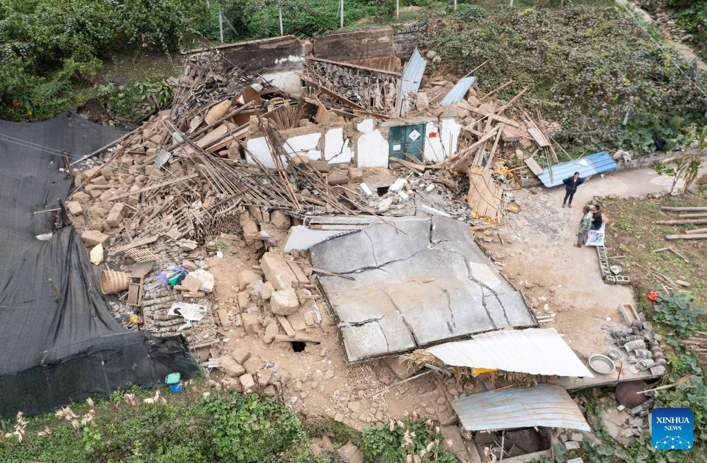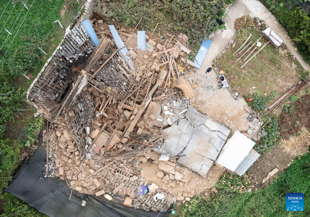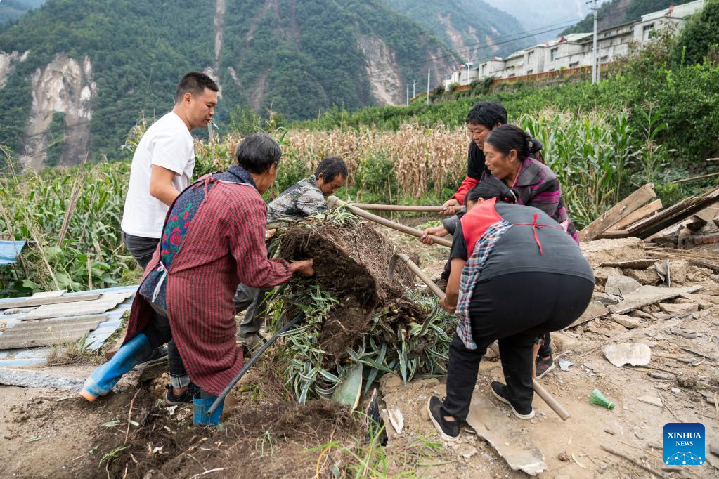 Villagers clear debris of a house damaged by earthquake in Xingfu Village of Shimian County, southwest China's Sichuan Province, Sept. 7, 2022. A 6.8-magnitude earthquake jolted southwest China's Sichuan Province on Monday, and Shimian County in Ya'an were one of the hardest-hit areas. The quake damaged houses, roads, water conservancy facilities, hydropower stations, and telecommunications.