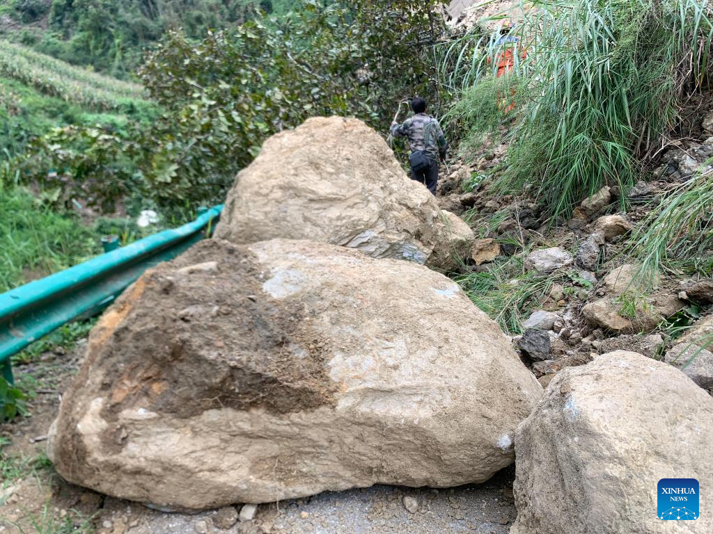 A road is blocked in Shimian County, southwest China's Sichuan Province, Sept. 7, 2022. A 6.8-magnitude earthquake jolted southwest China's Sichuan Province on Monday, and Shimian County in Ya'an were one of the hardest-hit areas. The quake damaged houses, roads, water conservancy facilities, hydropower stations, and telecommunications.