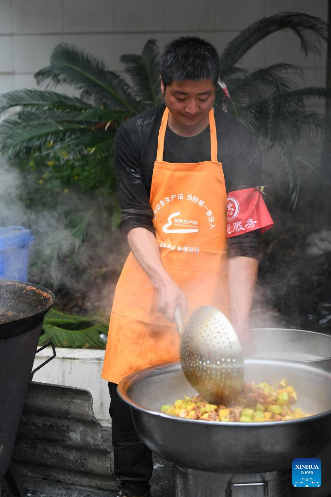A local villager prepares lunch at a quake relief shelter in Caoke Township of Shimian County, southwest China's Sichuan Province, Sept. 7, 2022. Rescuers arrived on foot on Tuesday afternoon and successfully opened up a "life channel" for Caoke, a township once lost contact with the outside world due to the severely damaged roads after the earthquake. (Xinhua/Xu Bingjie)