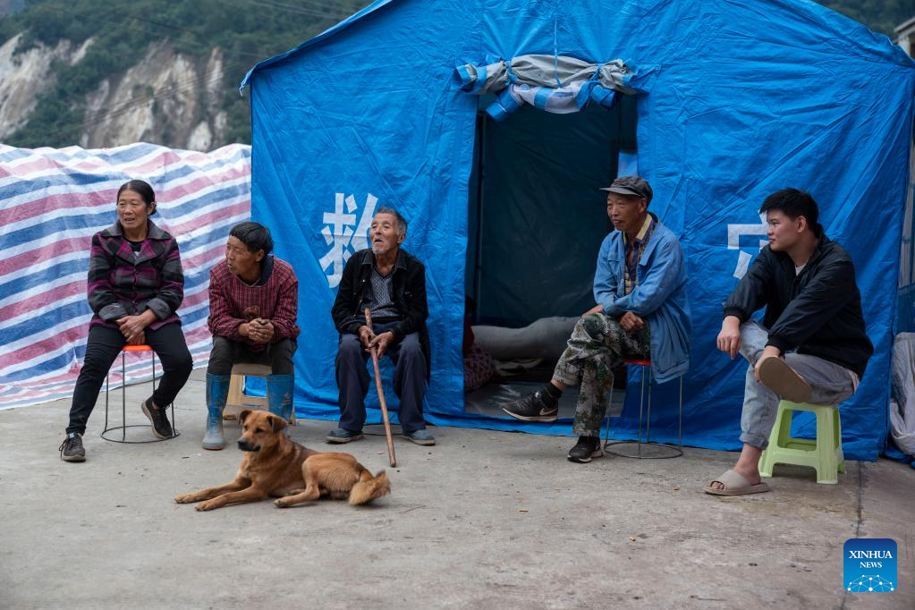 Villagers rest outside a tent in Xingfu Village of Shimian County, southwest China's Sichuan Province, Sept. 7, 2022. A 6.8-magnitude earthquake jolted southwest China's Sichuan Province on Monday, and Shimian County in Ya'an were one of the hardest-hit areas. The quake damaged houses, roads, water conservancy facilities, hydropower stations, and telecommunications.