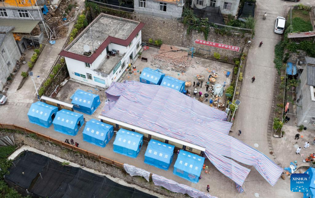 Aerial photo taken on Sept. 7, 2022 shows villagers preparing meal in Xingfu Village of Shimian County, southwest China's Sichuan Province. A 6.8-magnitude earthquake jolted southwest China's Sichuan Province on Monday, and Shimian County in Ya'an were one of the hardest-hit areas. The quake damaged houses, roads, water conservancy facilities, hydropower stations, and telecommunications.