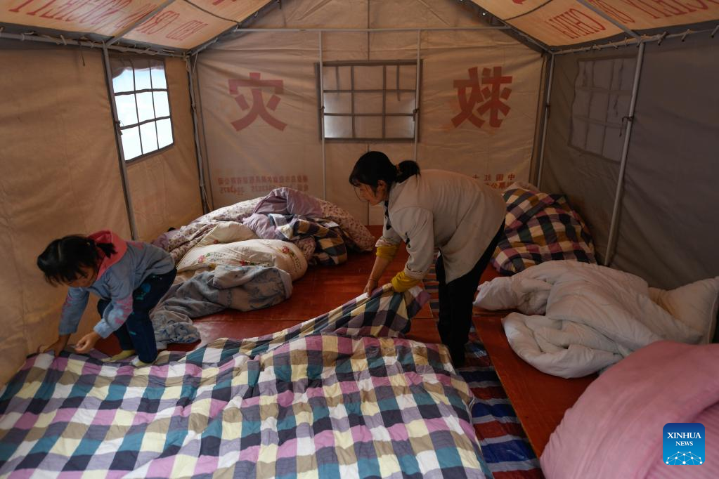 Local residents make bed in a tent at a quake relief shelter in Caoke Township of Shimian County, southwest China's Sichuan Province, Sept. 7, 2022. Rescuers arrived on foot on Tuesday afternoon and successfully opened up a "life channel" for Caoke, a township once lost contact with the outside world due to the severely damaged roads after the earthquake. (Xinhua/Xu Bingjie)