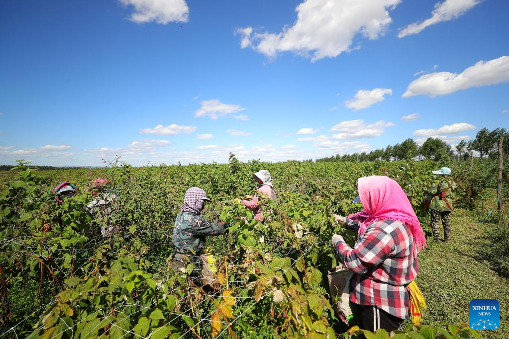 Farmers harvest raspberries at a raspberry planting base in Dengshipuzi Township of Faku County, northeast China's Liaoning Province, Sept. 6, 2022. Farmers in Dengshipuzi Township has more than 10 years of experience in growing raspberries which yields over 300 tons of the fruits annually. And at least 90 percent of these fruits are exported to countries like Japan, South Korea and the United States. (Xinhua/Yang Qing)