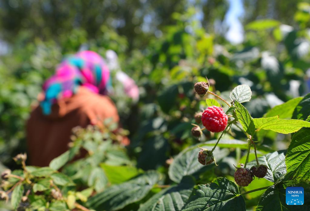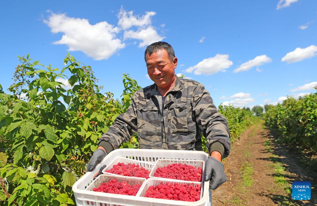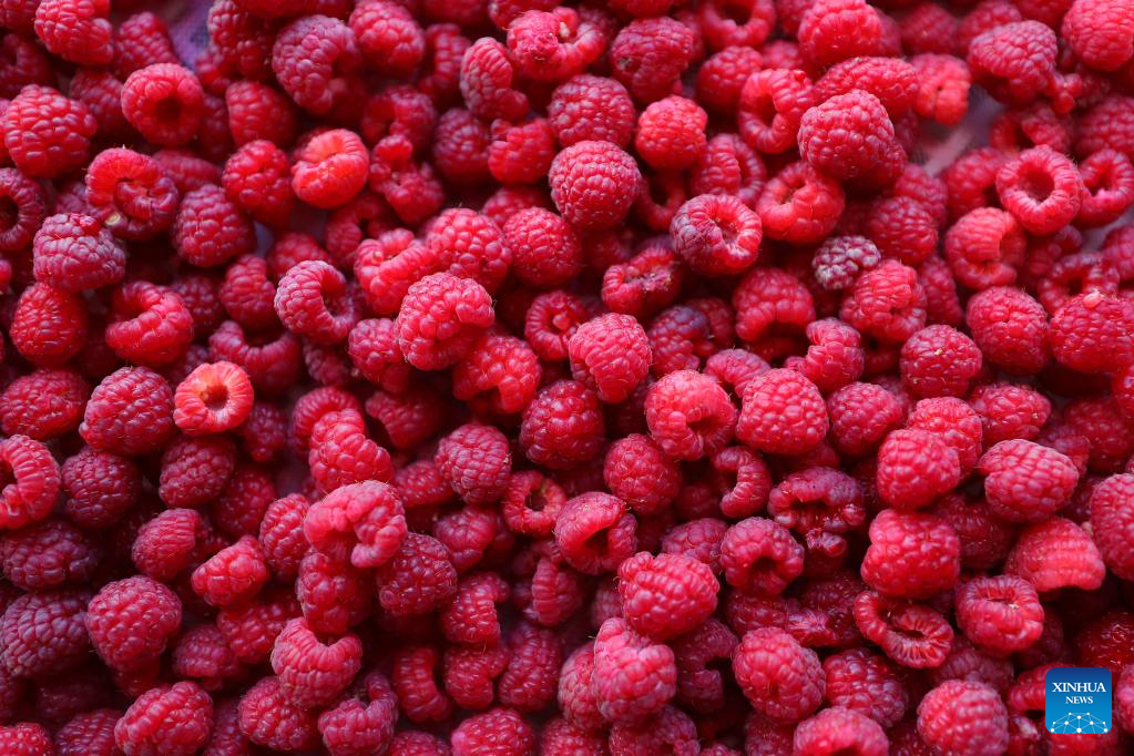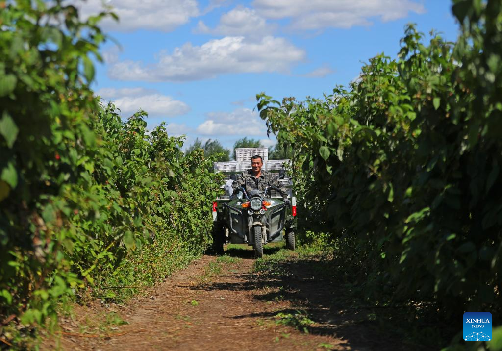 A farmer transports just-harvested raspberries at a raspberry planting base in Dengshipuzi Township of Faku County, northeast China's Liaoning Province, Sept. 6, 2022. Farmers in Dengshipuzi Township has more than 10 years of experience in growing raspberries which yields over 300 tons of the fruits annually. And at least 90 percent of these fruits are exported to countries like Japan, South Korea and the United States. (Xinhua/Yang Qing)