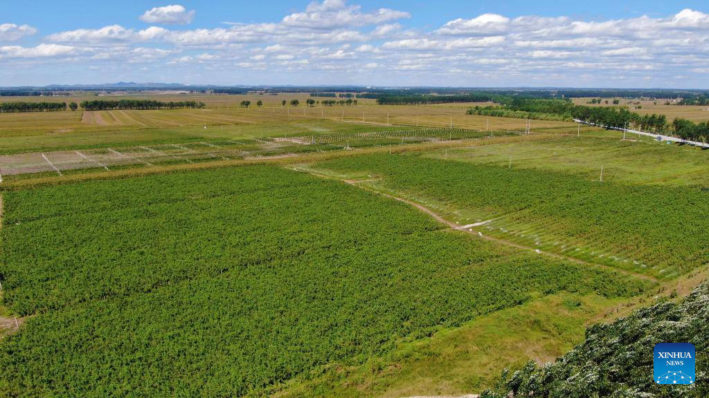 Aerial photo taken on Sept. 6, 2022 shows a view of the raspberry planting planting base in Dengshipuzi Township of Faku County, northeast China's Liaoning Province. Farmers in Dengshipuzi Township has more than 10 years of experience in growing raspberries which yields over 300 tons of the fruits annually. And at least 90 percent of these fruits are exported to countries like Japan, South Korea and the United States. (Xinhua/Yang Qing)