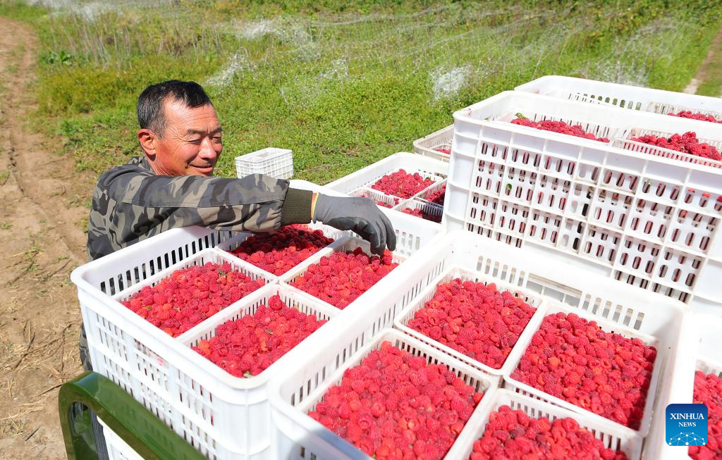 A farmer prepares to transport just-harvested raspberries at a raspberry planting base in Dengshipuzi Township of Faku County, northeast China's Liaoning Province, Sept. 6, 2022. Farmers in Dengshipuzi Township has more than 10 years of experience in growing raspberries which yields over 300 tons of the fruits annually. And at least 90 percent of these fruits are exported to countries like Japan, South Korea and the United States. (Xinhua/Yang Qing)