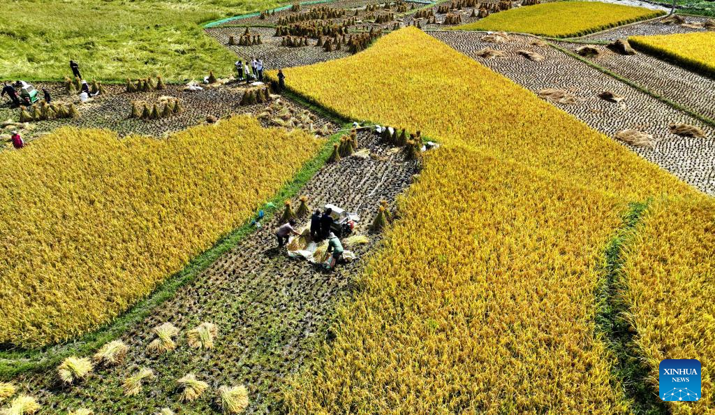 Aerial photo taken on Sept. 6, 2022 shows villagers harvesting rice in Xigou Village of Ningqiang County, northwest China's Shaanxi Province. As the headwater region of the Hanjiang River, the largest tributary of the Yangtze River, Ningqiang County has closed ten mines and promoted a series of ecological protection projects for environmental protection in recent years. The county has also promoted the production of agricultural products including tea, fruits, vegetables, etc., managing and transforming ecological resources to green economy. (Xinhua/Tao Ming)
