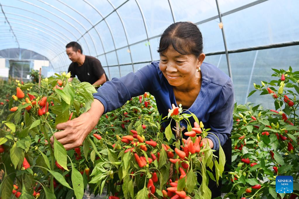 Staff members pick hot peppers in a greenhouse in Ningqiang County, northwest China's Shaanxi Province, Sept. 7, 2022. As the headwater region of the Hanjiang River, the largest tributary of the Yangtze River, Ningqiang County has closed ten mines and promoted a series of ecological protection projects for environmental protection in recent years. The county has also promoted the production of agricultural products including tea, fruits, vegetables, etc., managing and transforming ecological resources to green economy. (Xinhua/Tao Ming)