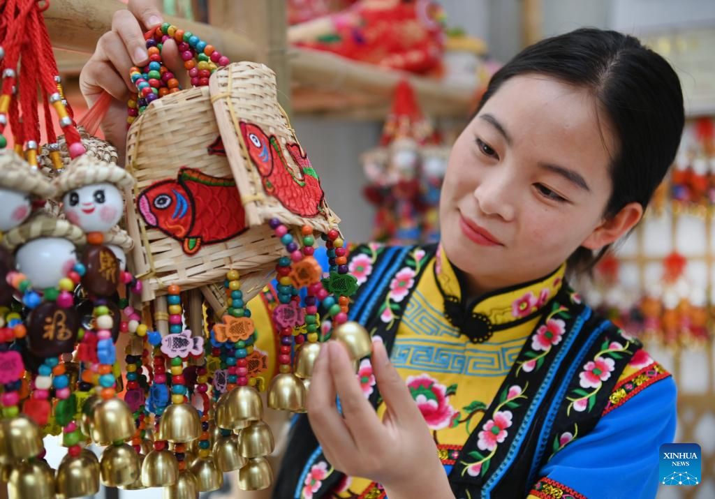 A woman views bamboo weaving products of Qiang ethnic group at an exhibition hall in Ningqiang County, northwest China's Shaanxi Province, Sept. 7, 2022. As the headwater region of the Hanjiang River, the largest tributary of the Yangtze River, Ningqiang County has closed ten mines and promoted a series of ecological protection projects for environmental protection in recent years. The county has also promoted the production of agricultural products including tea, fruits, vegetables, etc., managing and transforming ecological resources to green economy. (Xinhua/Tao Ming)