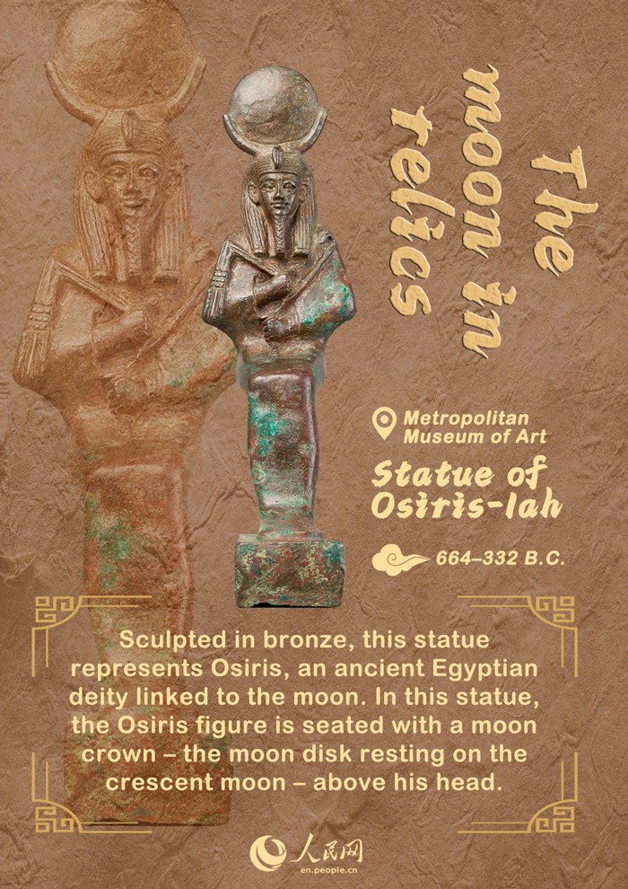 In ancient Egyptian mythology, Osiris is the god of the deceased, and changes of the moon recall his continual rebirth and regeneration. That’s why his crown encompasses the moon in all of its phases.