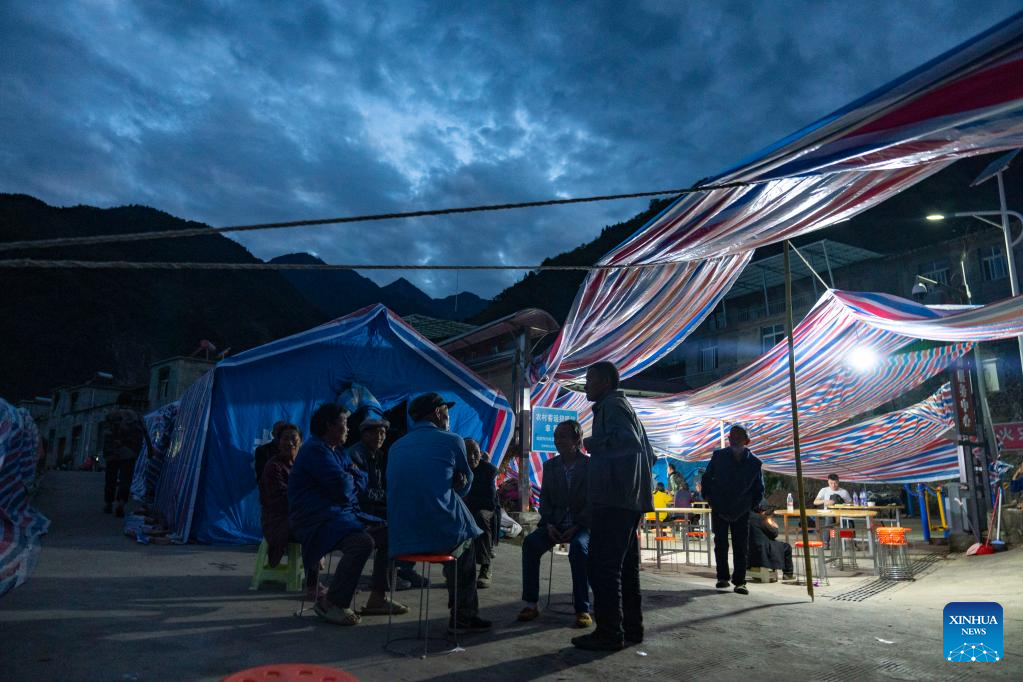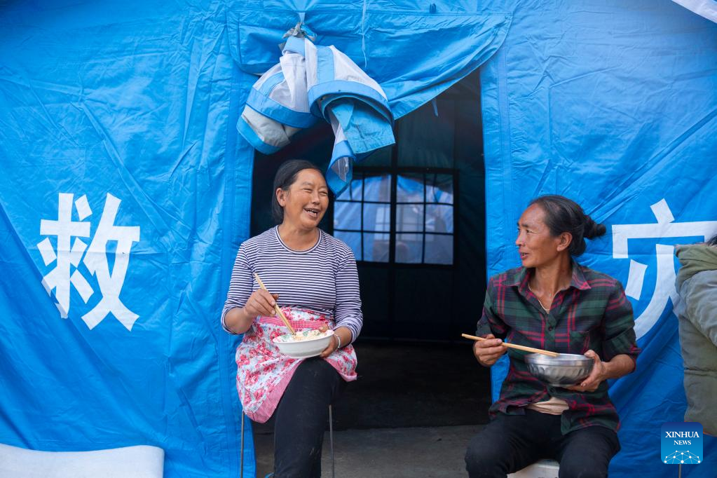 Villagers have a meal outside a tent in Xingfu Village of Shimian County, Ya'an City, southwest China's Sichuan Province, Sept. 10, 2022. (Xinhua/Cai Yang)