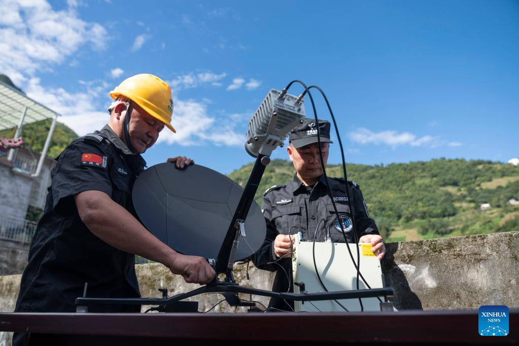 Technician Liao Hua (L) installs a portable satellite station with his colleague in Xingfu Village of Shimian County, Ya'an City, southwest China's Sichuan Province, Sept. 10, 2022. (Xinhua/Cai Yang)