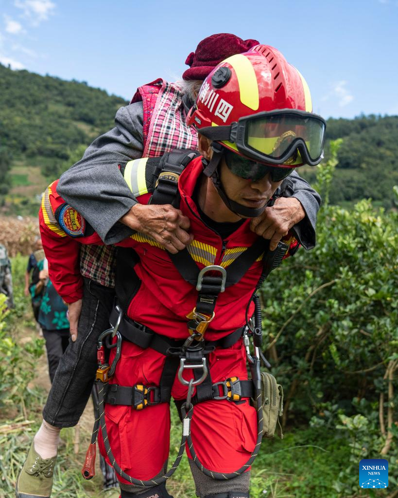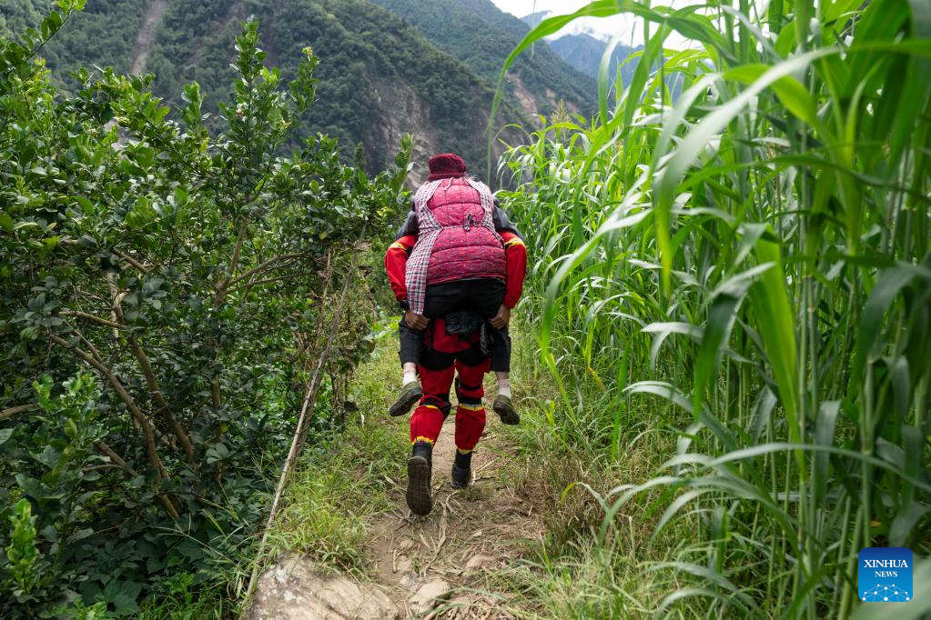 A rescuer transfers a sick elder woman in Xingfu Village of Shimian County, Ya'an City, southwest China's Sichuan Province, Sept. 10, 2022. (Xinhua/Cai Yang)