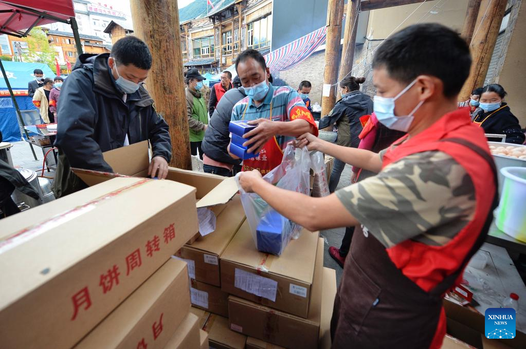 A volunteer distributes mooncakes for the earthquake-affected villagers on the occasion of the Mid-Autumn Festival at a relocation site in Shimian County of Ya'an City, southwest China's Sichuan Province, Sept. 10, 2022. (Xinhua/Liu Qiong)