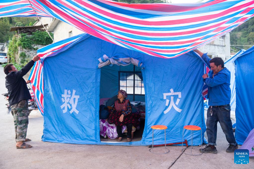 Villagers help an elder lady lay waterproof cloth on her tent in Xingfu Village of Shimian County, southwest China's Sichuan Province, Sept. 10, 2022. (Xinhua/Cai Yang)