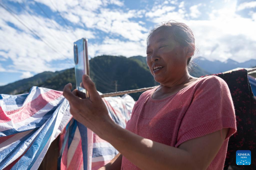 A villager talks with her family via vedio link after a portable satellite station is set up in Xingfu Village of Shimian County, Ya'an City, southwest China's Sichuan Province, Sept. 10, 2022. (Xinhua/Cai Yang)