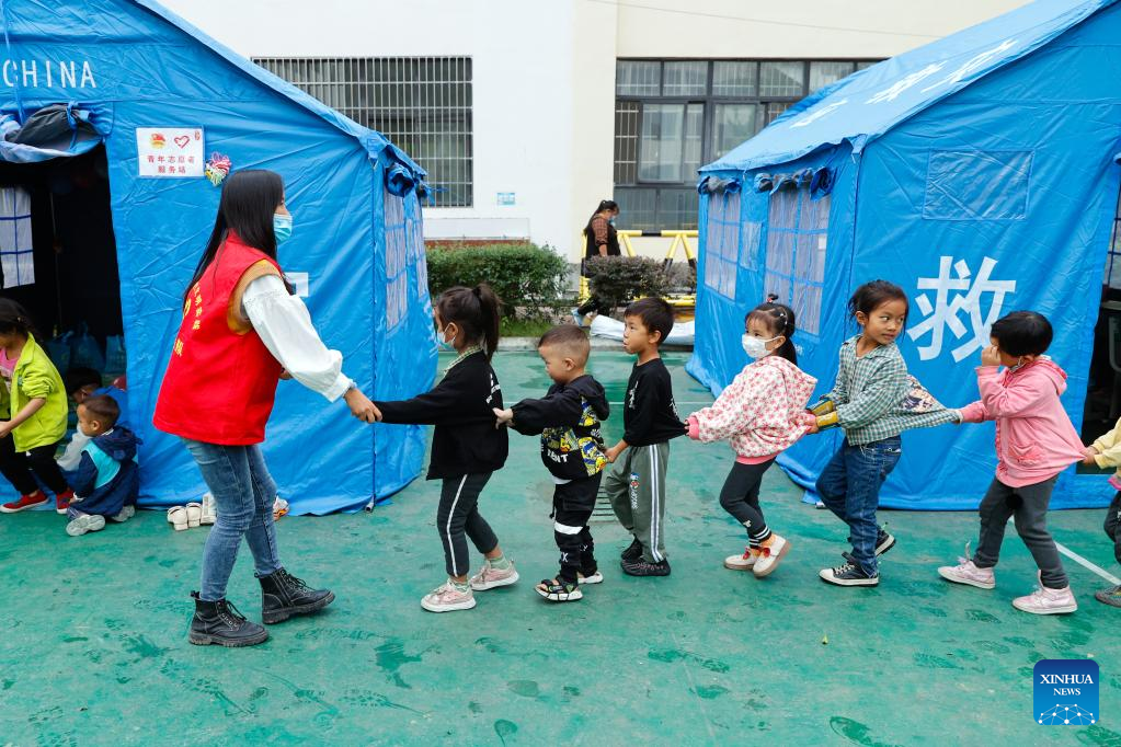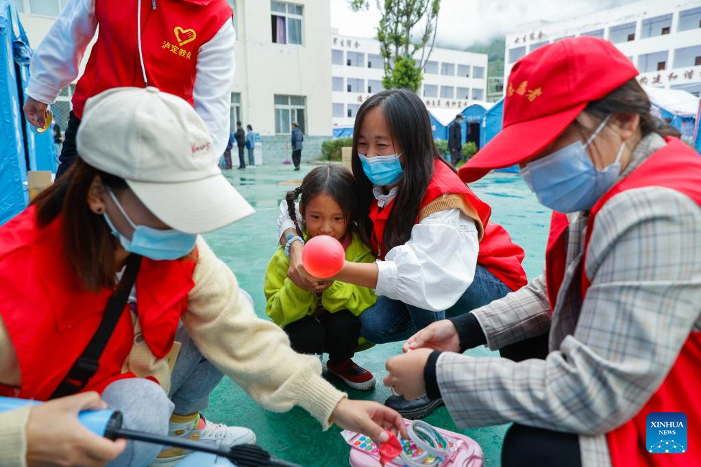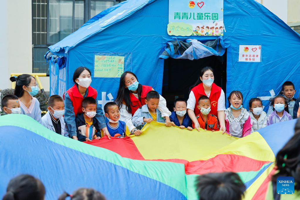 Luo Lian and volunteers play games with kids at the quake relief shelter of Luding No. 2 high school in Luding County, southwest China's Sichuan Province, Sept. 10, 2022. Luo Lian, 32, is a kindergarten teacher in Lengqi Town of Luding County.