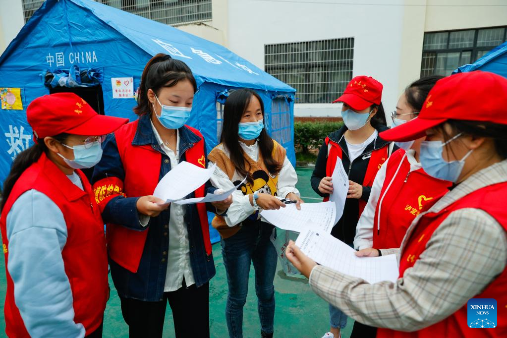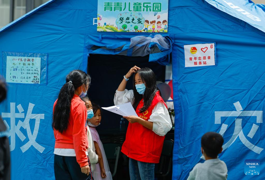 Luo Lian (2nd R) takes records of the kids before they enter the tent classroom at the quake relief shelter of Luding No. 2 high school in Luding County, southwest China's Sichuan Province, Sept. 10, 2022. Luo Lian, 32, is a kindergarten teacher in Lengqi Town of Luding County.