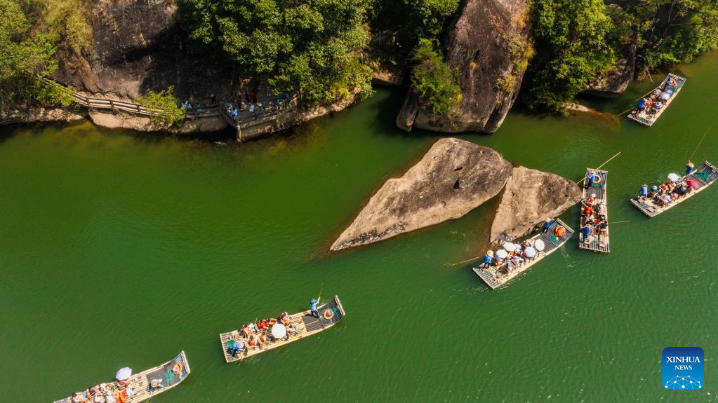 Aerial photo shows people taking bamboo rafts to appreciate scenery during the Mid-Autumn Festival holiday in the Wuyishan National Park, southeast China's Fujian Province, Sept. 11, 2022.