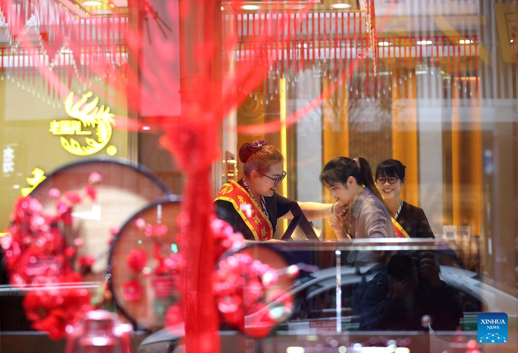 A customer tries gold jewelry at a store during the Mid-Autumn Festival holiday in Danzhai County, southwest China's Guizhou Province, Sept. 11, 2022.