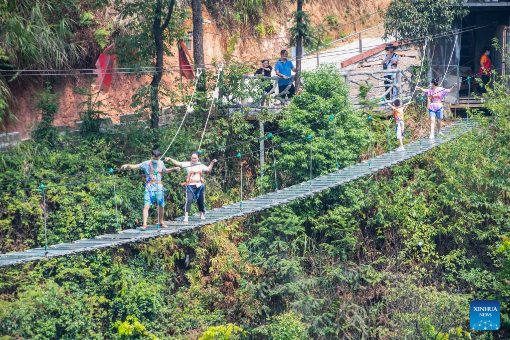 People walk on a glass-bottomed bridge during the Mid-Autumn Festival holiday in Banan District of southwest China's Chongqing, Sept. 11, 2022.