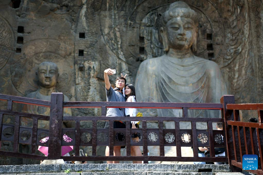 Tourists take selfies at the Longmen Grottoes during the Mid-Autumn Festival holiday in Luoyang, central China's Henan Province, Sept. 11, 2022.