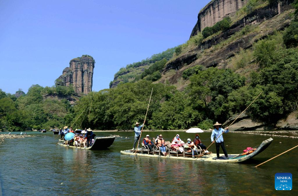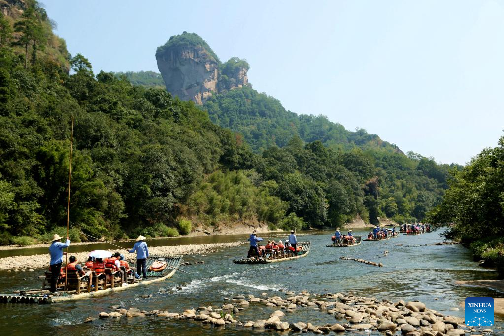 People take bamboo rafts to appreciate scenery during the Mid-Autumn Festival holiday in the Wuyishan National Park, southeast China's Fujian Province, Sept. 11, 2022.